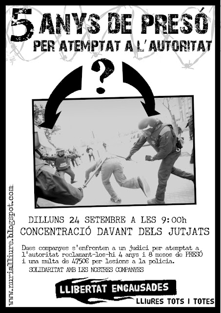 Arran d’una encadenada a la subdelegació del govern en el marc de les setmanes d’acció en solidaritat amb la nostra companya Núria, dues companyes s’enfronten a un judici per atemptat a l'autoritat reclamant-los-hi 4 anys i 8 mesos de presó i una multa de 4750€ per lesions a la policia.