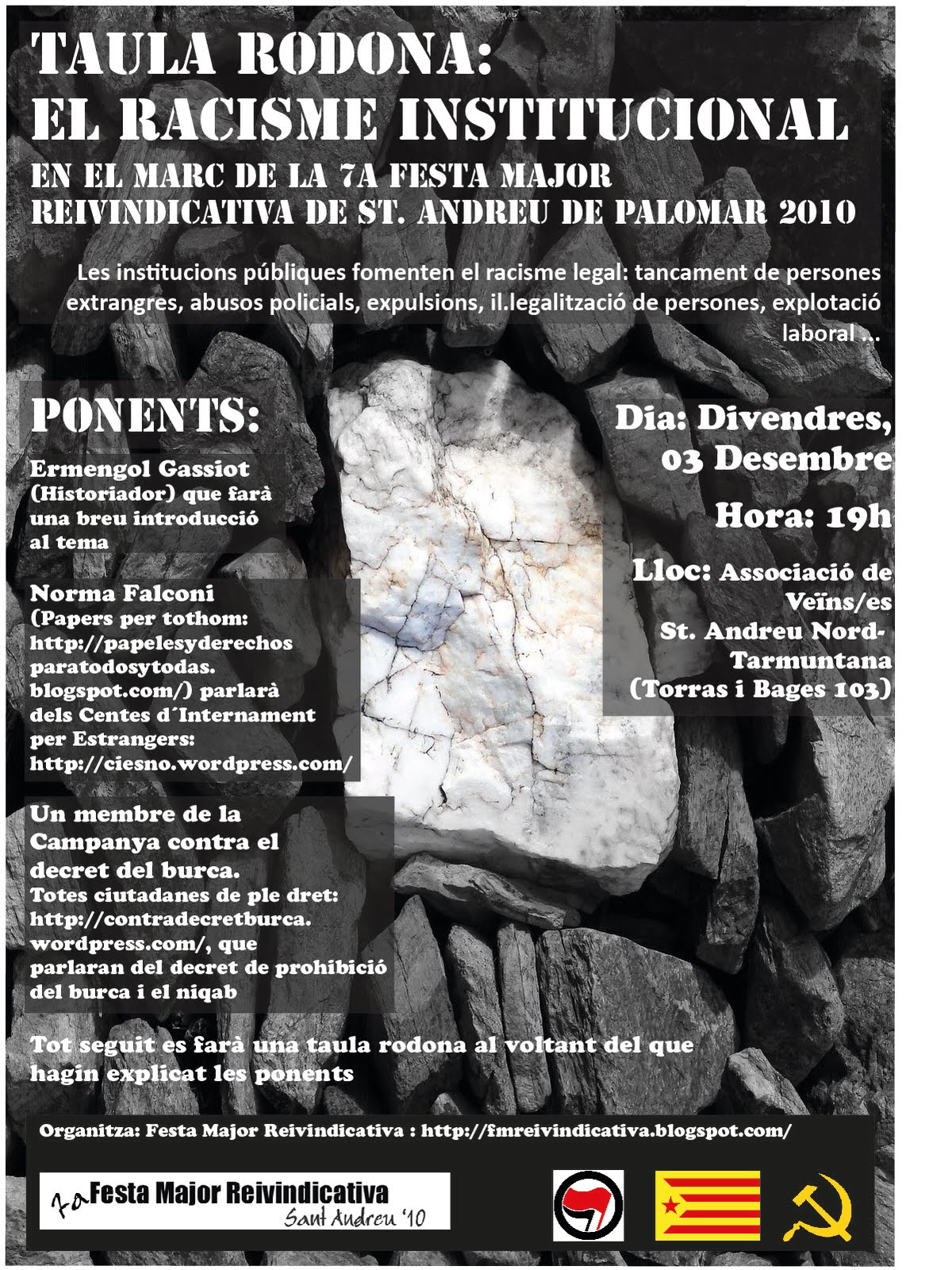 Resum: Les institucions públiques fomenten el racisme legal: tancament de persones extrangeres, abusos policials, expulsions, il.legalització de persones, explotació laboral ...